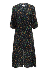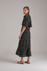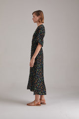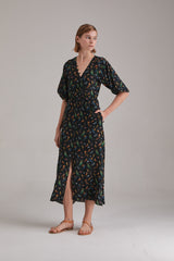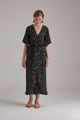 Cut from our flattering 100% silk fabric, this dress achieves romanticism through its waist highlighting shape and feminine details. It has a V-neckline, slightly puffed shoulders that break into relaxed sleeves. Easy to wear and very light weight, it is the perfect piece to pack for a vacation